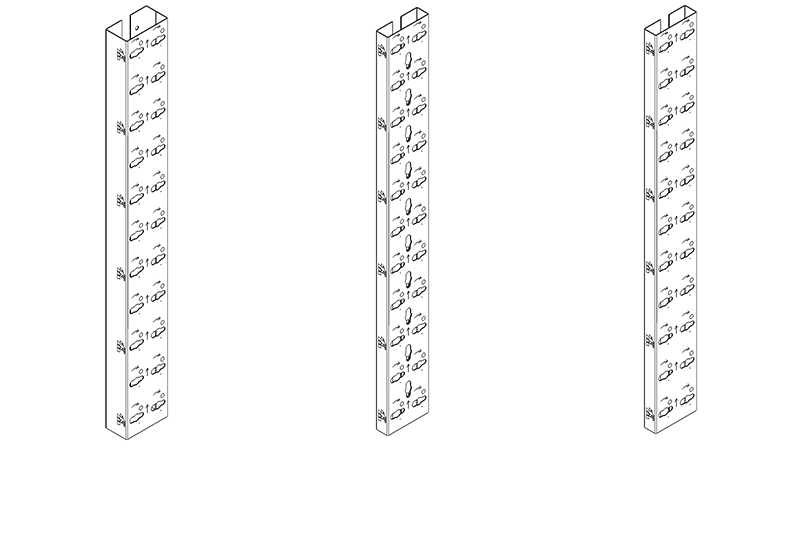 Profilo a “C” in acciaio zincato o inox, asolato, punzonato e piegato a freddo su profilatrice. Lunghezza standard da 3 m successivamente tagliata a misura. Disponibile con profondità da 25 mm e 45 mm, su richiesta con asola centrale ruotata. I profili sono disponibili in due moduli: modulo 1 con passo delle asole da 66 mm, modulo 2 con passo da 151,25 mm.